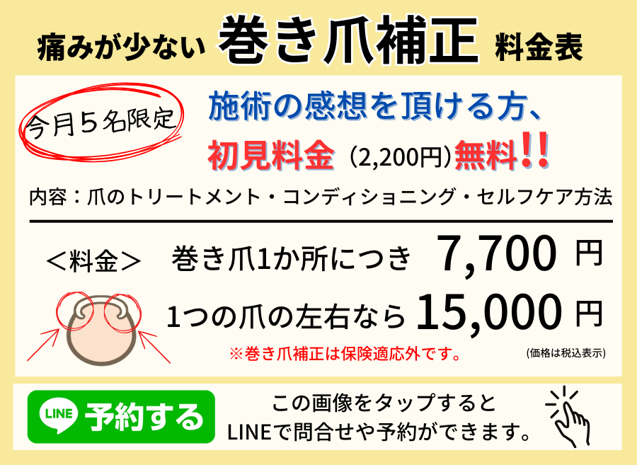 巻き爪治療を病院で爪を取ってしまうつもりでしたが、痛みのない治療で助かりました。 後は通院で完治を目指します。※個人の感想です。 同等の効果や結果を保証するものではありません。