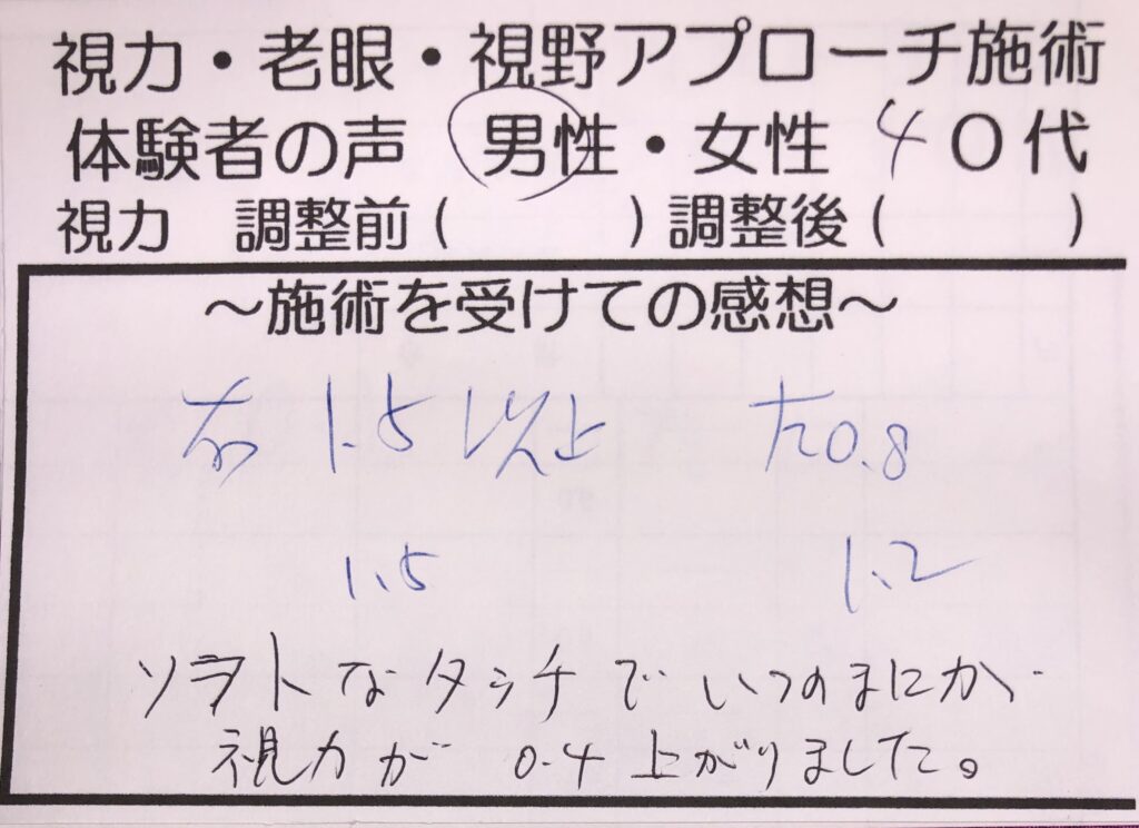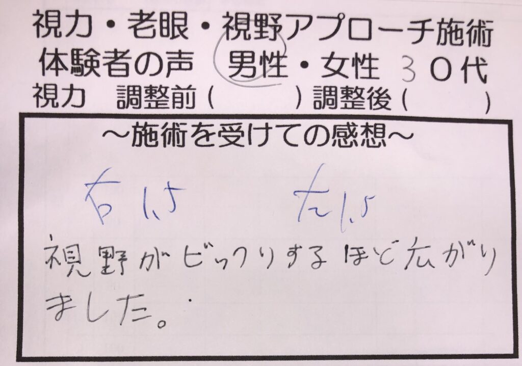 左目が見えづらかったのですが、驚くほどに見えるようになりました。びっくりしました。ありがとうございます。