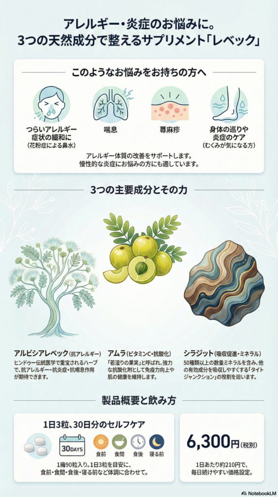 AID-006 レベックは、花粉やアレルギー、慢性的な炎症が気になる方のための体調管理サプリメントです。