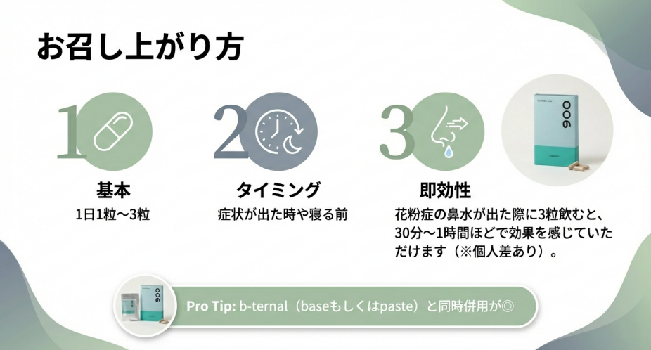 寝る前に取り入れる方や、外出前・症状が出やすいタイミングの前に飲む方も多いです。
