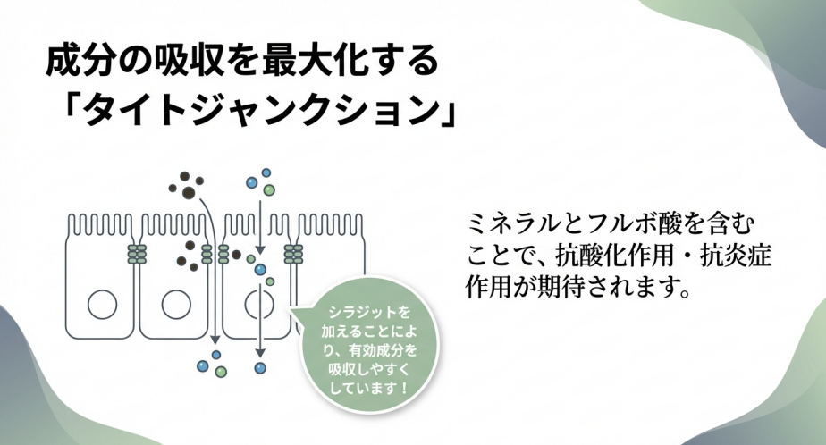 50種類以上の微量ミネラルやフルボ酸を含むとされ、栄養をムダなく活かしたい方の体調管理をサポートする成分として注目されています。
