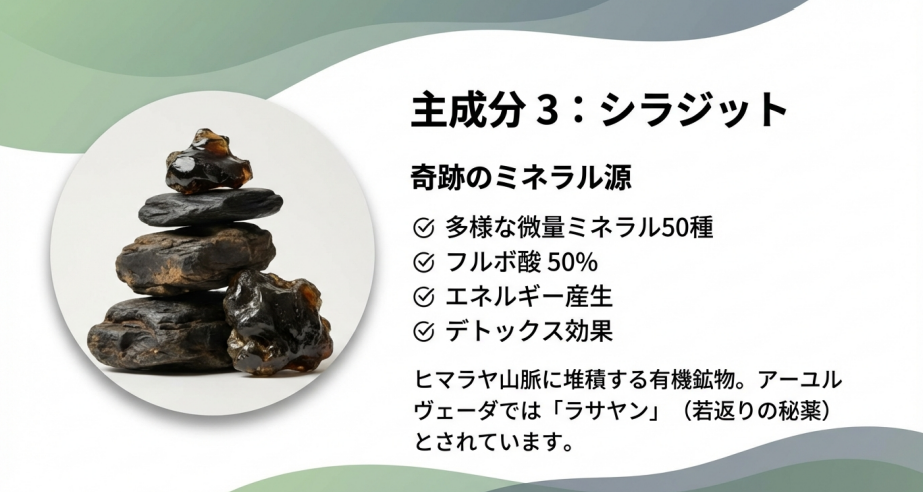 シラジットは、ヒマラヤ山脈の高地(標高3,000m以上の地域)で採取される希少な天然由来成分で、伝統的には「生命の源(ラサヤナ)」として重宝されてきた背景があります。
